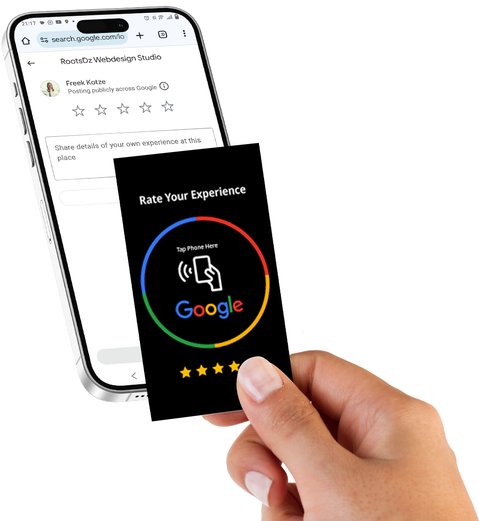Boost your Google Review on the go or with a display stand. Tap and review. Revolutionary technology from ROOCoRP Holdings